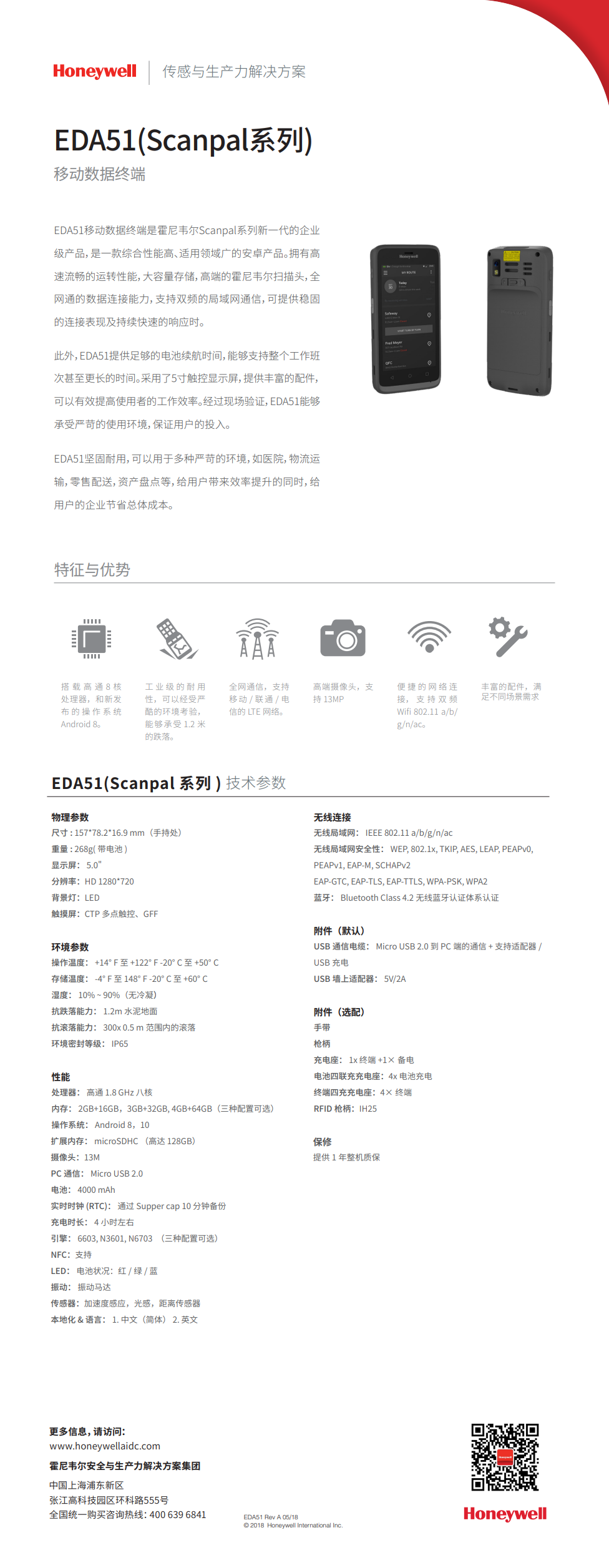 卓越性能 ScanPal™: EDA51 移动计算机基于 Android™: 开发,集成扫描、强大的处理功能、直观的触摸屏界面,以及通过坚固耐用、纤薄的人体工学设计实现出色的连接性。它是中小型企业提高轻型零售、店铺直送、取货和送货以及现场服务应用生产率的理想选择。 产品参数 尺寸:157 mm x 78.2 mm x 16.9 mm 重量:268克 ,含电池 操作系统:Android 8,10 CPU:高通 1.8GHz 八核 抗跌落性能:1.2m水泥地面 抗滚落性能:300*0.5m 范围内的滚落 防护等级:IP65 行业应用 • 现场服务 • 零售 |