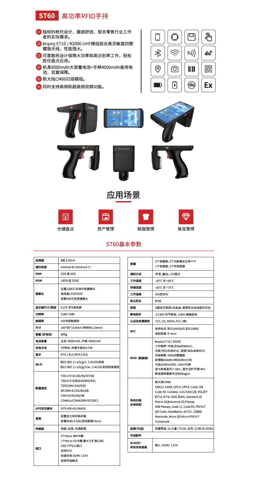 产品参数 充电时间:PE快充,充满不超过4小时 操作系统:Android 8.1/ Android 11 处理器:8核 2.0GHz 密封:IP65 跌落公差:6面均可承受1.5米高度跌落到水泥地面的冲击 解码能力:一维、二维、PDF417 分辨率:2160*1080 行业应用 • 仓储盘点 • 资产管理 • 鞋服管理 • 珠宝管理 |