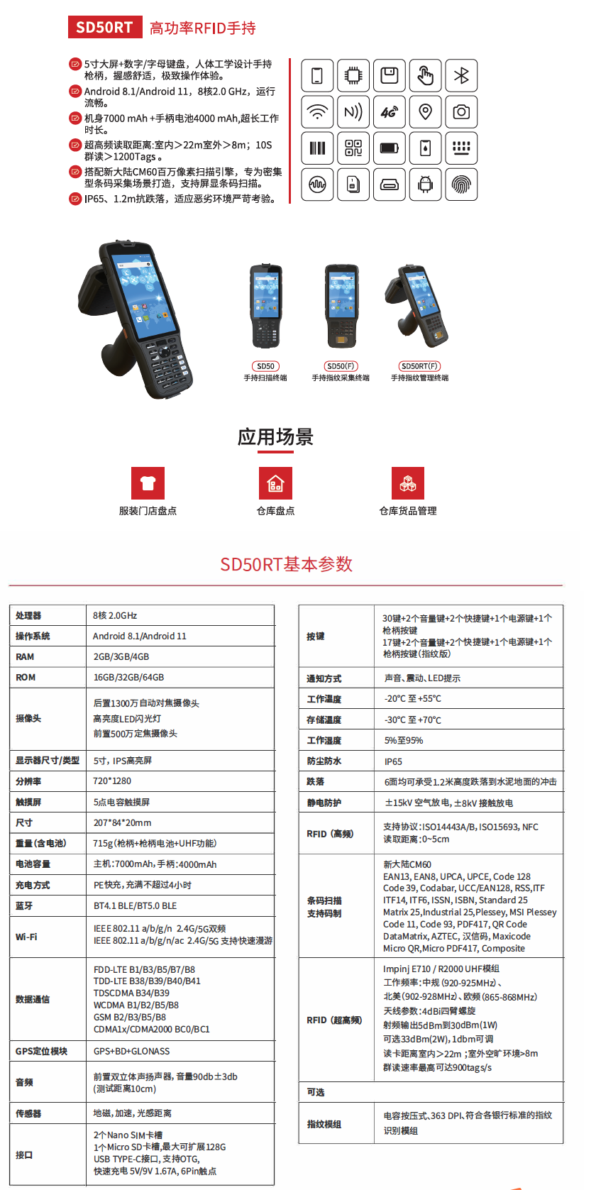 产品参数 充电时间:PE快充,充满不超过4小时 操作系统:Android 8.1/Android 11 处理器:8核 2.0GHz 密封:IP65 跌落公差:6面均可承受1.5米高度跌落到水泥地面的冲击 解码能力:一维、二维、PDF417 分辨率:720*1280 行业应用 • 服装门店盘点 • 仓库盘点 • 仓库货品管理 |