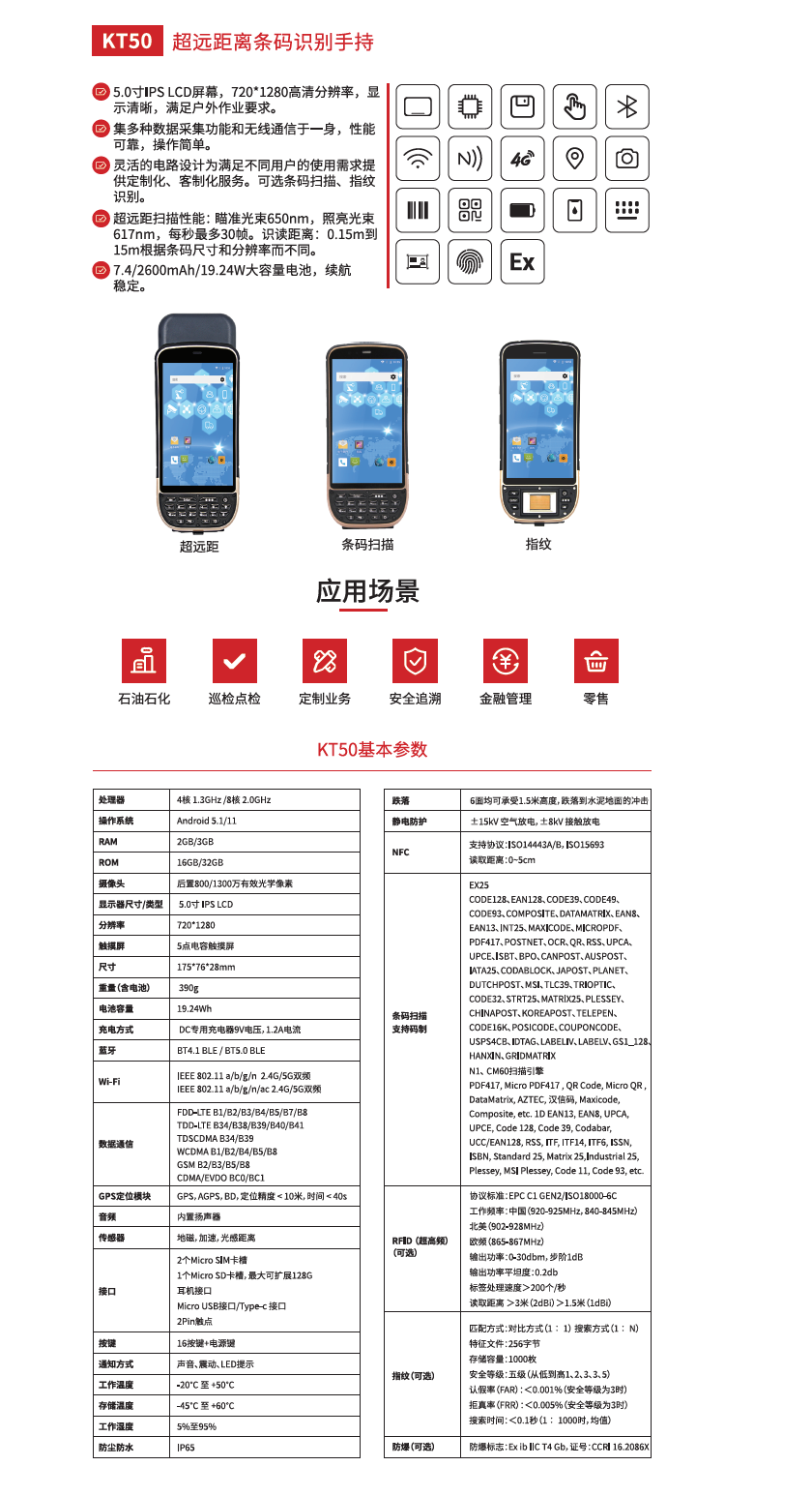 产品参数 充电方式:DC专用充电器9V电压,1.2A电流 操作系统:Android 5.1/11 处理器:4核 1.3GHz/8核 2.0GHz 密封:IP65 跌落公差:6面均可承受1.5米高度跌落到水泥地面的冲击 解码能力:一维、二维、PDF417 分辨率:720*1280 行业应用 • 石油石化 • 巡检点检 • 定制业务 • 安全追溯 • 金融管理 • 零售 |