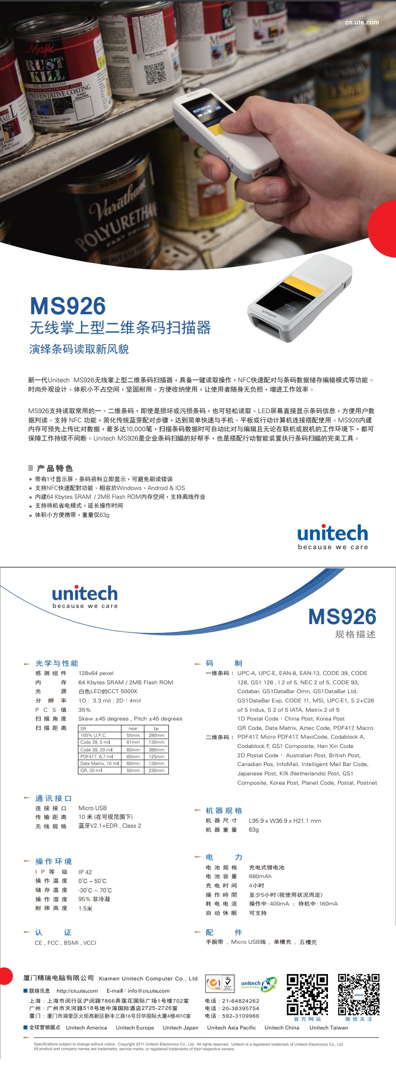 卓越性能 新一代Unitech MS926无线掌上型二维条码扫描器,具备一键读取操作,NFC快速配对与条码数据储存编辑模式等功能。时尚外观设计、体积小不占空间,坚固耐用。方便收纳使用,让使用者随身无负担,增进工作效率。MS926支持读取常用的一、二维条码,即使是损坏或污损条码,也可轻松读取。 产品参数 尺寸:36.9x 95.9 x 21.1 mm 重量:63g (含电池) 密封:IP42 耐摔高度:1.5米 解码能力:1D, 2D 扫描技术:二维影像式(128x 64 pixels) 行业应用 • 餐旅接待 • 现场服务 • 智慧医疗 |