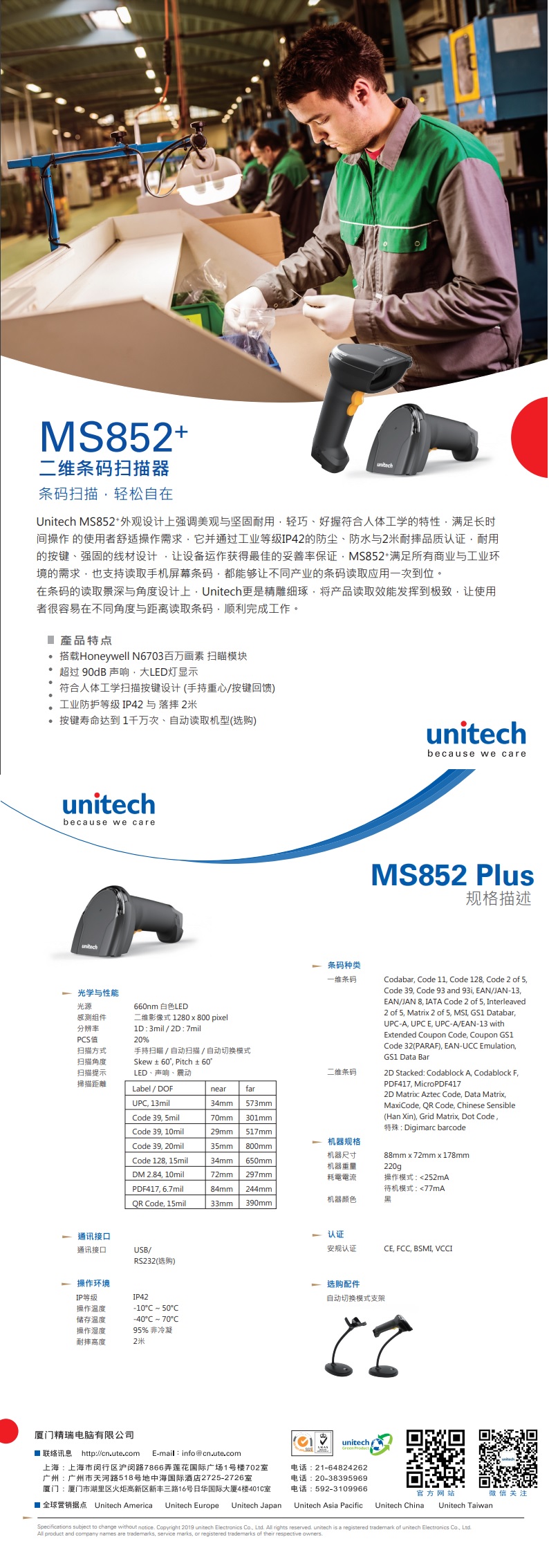 卓越性能 unitech MS852+拥有超过 90dB 声响及大LED灯显示,而且支持特殊OCR、Dot codes和 Digimarc条形码,并通过工业防护等级的质量认证,让设备运作获得最佳的妥善率保证。 产品参数 尺寸:87.8 x 71.6 x 177.7mm 重量:165克(不含线材) 密封:IP42 耐摔高度:2米 解码能力:1D,2D 扫描技术:二维影像式(1280 x800 pixels) 行业应用 • 智慧零售 • 智慧制造 • 医疗保障 |