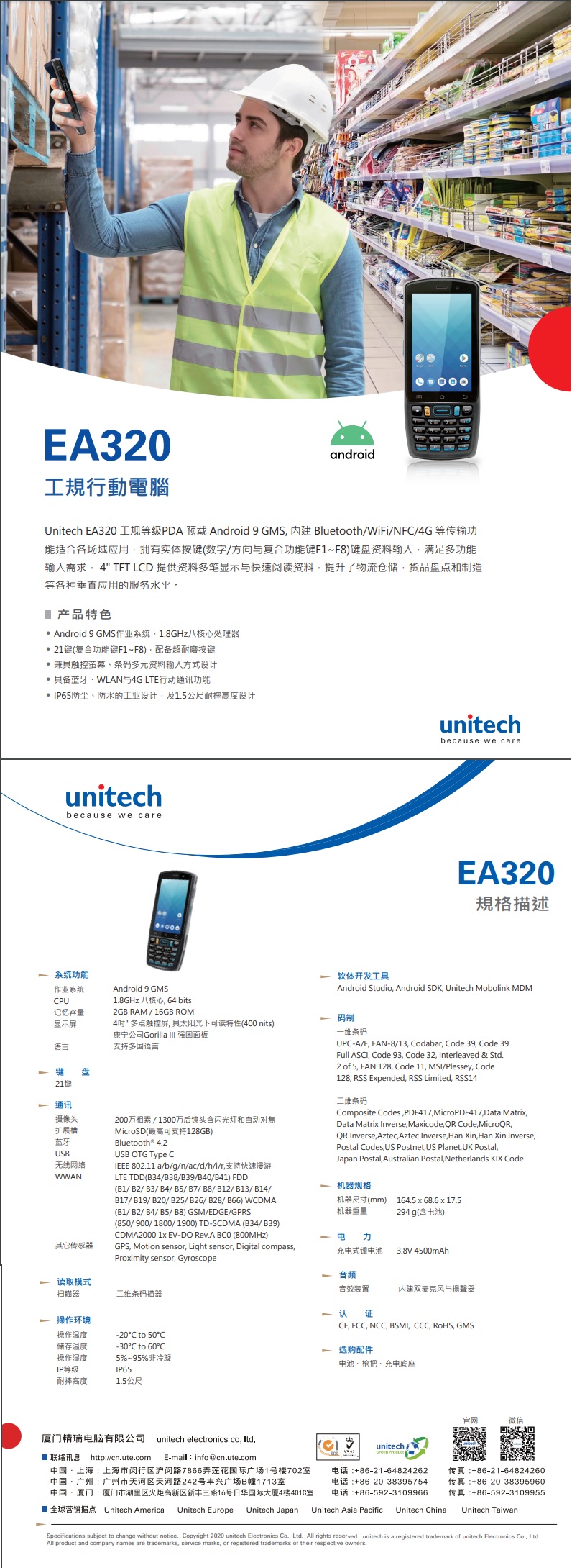 卓越性能 Unitech EA320 工规等级PDA 预载 Android 9 GMS, 内建Bluetooth/WiFi/NFC/4G 等传输功 能适合各场域应用,拥有实体按键(数字/方向与复合功能键F1~F8)键盘资料输入,满足多功能 输入需求, 4" TFT LCD 提供资料多笔显示与快速阅读资料,提升了物流仓储,货品盘点和制造 等各种垂直应用的服务水平。 产品参数 尺寸:164.5 x 68.6 x 17.5mm 重量:294 g(含电池) 操作系统:Android 9 GMS CPU:1.8GHz 八核心, 64 bits 内存: 2GB RAM / 16GB ROM 跌落规格:1.5公尺耐摔防护 IP 密封:IP65 行业应用 • 智慧零售 • 物流运输 • 仓储管理 • 现场服务 • 智慧制造 |